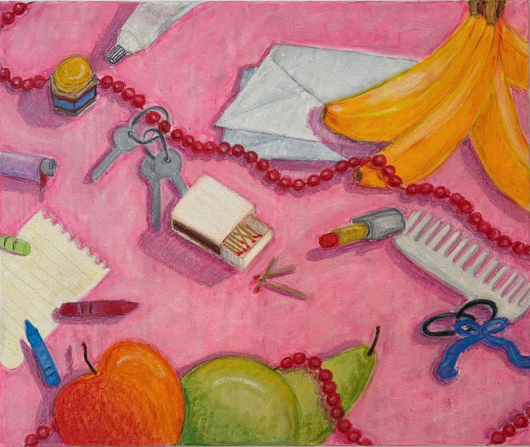 While the works embrace a vibrant, cluttered energy, they are built on a foundation of deliberate composition. It is a playful exploration of the tension between letting go and enjoying the chaos, where every seemingly accidental detail finds its own balance. This body of work celebrates the "messy aesthetic" not as a lack of order, but as a living, intuitive form of expression.