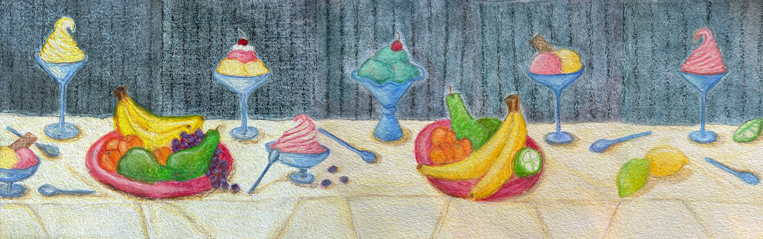 The focus on fruits and ice cream sundaes plays with simple forms and objects that fascinate in a childlike, intuitive way. Through a playful lens, these everyday symbols of indulgence become vessels for nostalgia.